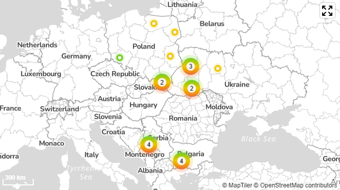 The Locations panel on the left lists all monitored locations with a colour-coded risk indicator. You can search by name to quickly find a specific location. Selecting a location in this panel highlights it on the map and scrolls the locations table to it.