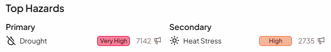 The Top Hazards card highlights the primary and secondary weather stressors currently driving risk across all locations. Hazards are ranked by their average risk score across all monitored locations. This tells you not just that risk is elevated, but what kind of weather is driving it - whether drought, heat, frost, or excessive rainfall.