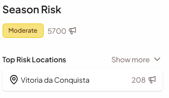 The Season Risk card shows the overall risk level and score for the selected crop and region at a glance. The colour-coded badge (VL to VH) and numerical score (0-100) reflect the current season's accumulated weather stress compared to the historical baseline. Below the score, the card lists the top risk locations - the individual monitored locations with the highest current risk.