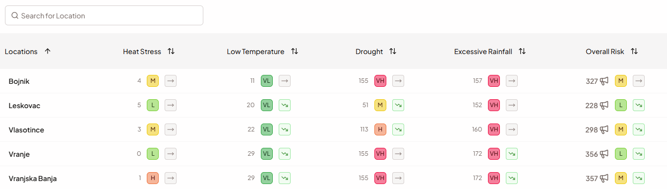 The Locations table at the bottom of the dashboard gives you a systematic, side-by-side comparison of risk across every monitored location. For each location, the table shows the overall Season Risk level and trend, plus a per-hazard breakdown with three columns for each of the four hazards: the weighted alert total for the season (Critical = 2, Warning = 1), the Season Risk score for that hazard, and its risk trend. You can search by location name and sort by any column. Click a row to open the full Location View for that location.