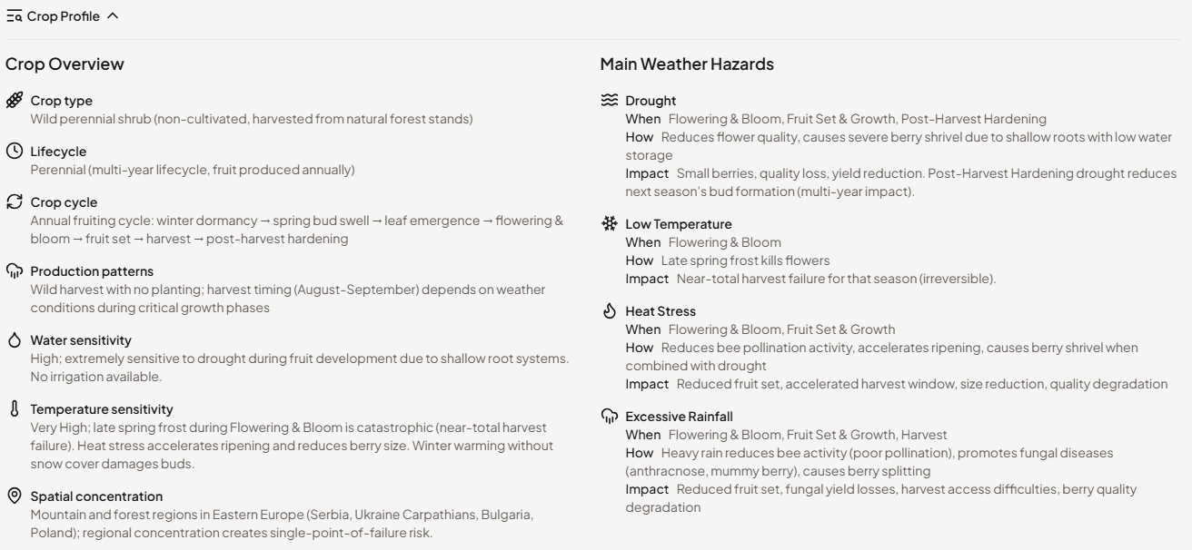 The main weather risks section describes what each hazard type means for this specific crop: which phases are most sensitive, what kind of damage is caused by heat, frost, drought, or excessive rainfall, and how severe the impact tends to be. This is written in plain language, not in meteorological terms.