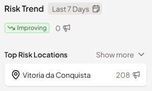 The Risk Trend card shows how much the Season Risk Score has changed over a recent period. The default window is the past seven days, but it can be adjusted using the selector on the card. A "Worsening" indicator means conditions have deteriorated relative to historical norms; it also shows which locations have seen the largest recent increases. This helps you distinguish between a stable situation and one that is actively moving in the wrong direction.