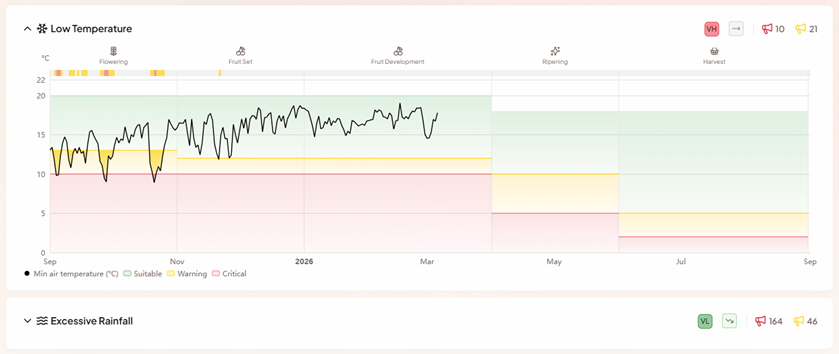 Within each chart, horizontal coloured bands show the Warning and Critical threshold zones for the current growth phase. These bands shift at phase boundaries - the phase labels are shown along the top of each chart, so you can immediately see what part of the crop cycle you are looking at and how conditions compare to the thresholds that apply at that stage.