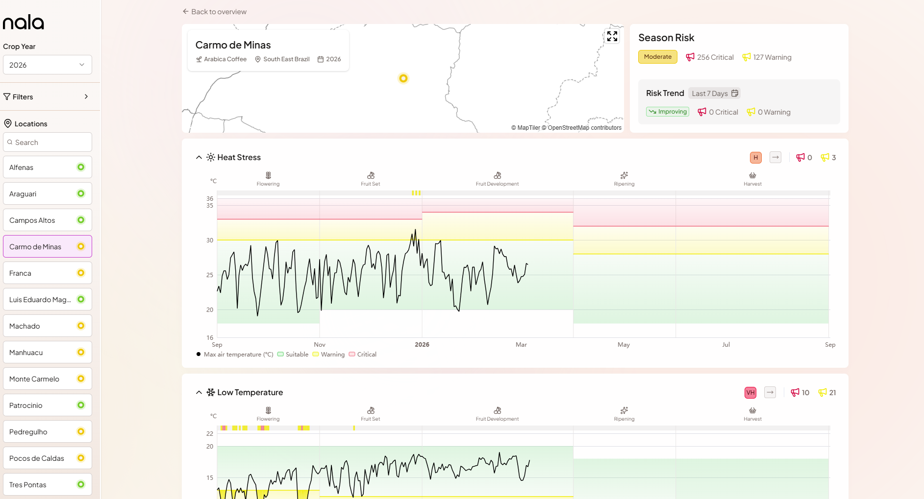 Each hazard section also displays its individual Season Risk Level badge and the cumulative count of Critical and Warning alerts for the season to date. This makes it easy to see at a glance which stressors are driving the overall risk and which are within normal range.